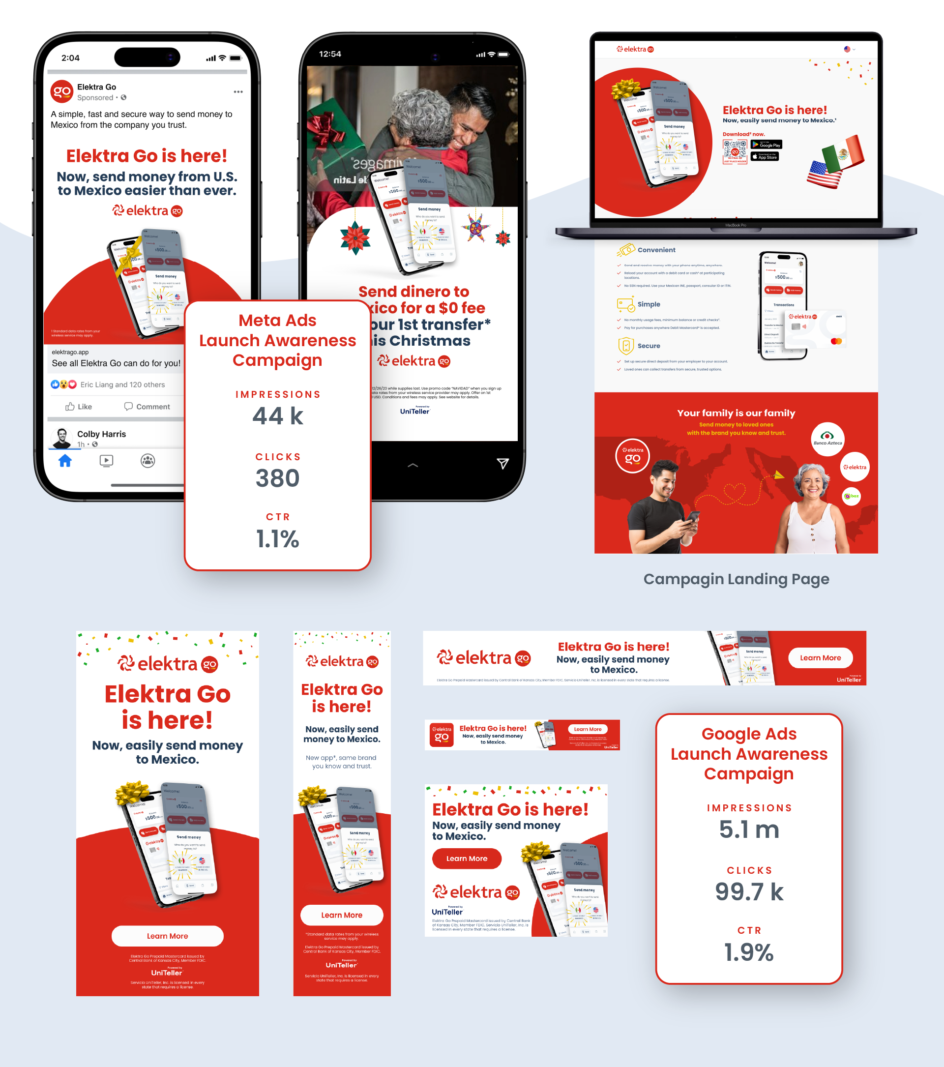 For the launch campaign, we developed an awareness strategy that leveraged the name recognition and brand trust of Elektra while announcing that the app is now here and making it easier than ever to send money to the U.S. We launched and managed the campaign on Google Ads and Meta Ads, achieving over 5 million impressions—a huge win for prospect awareness!