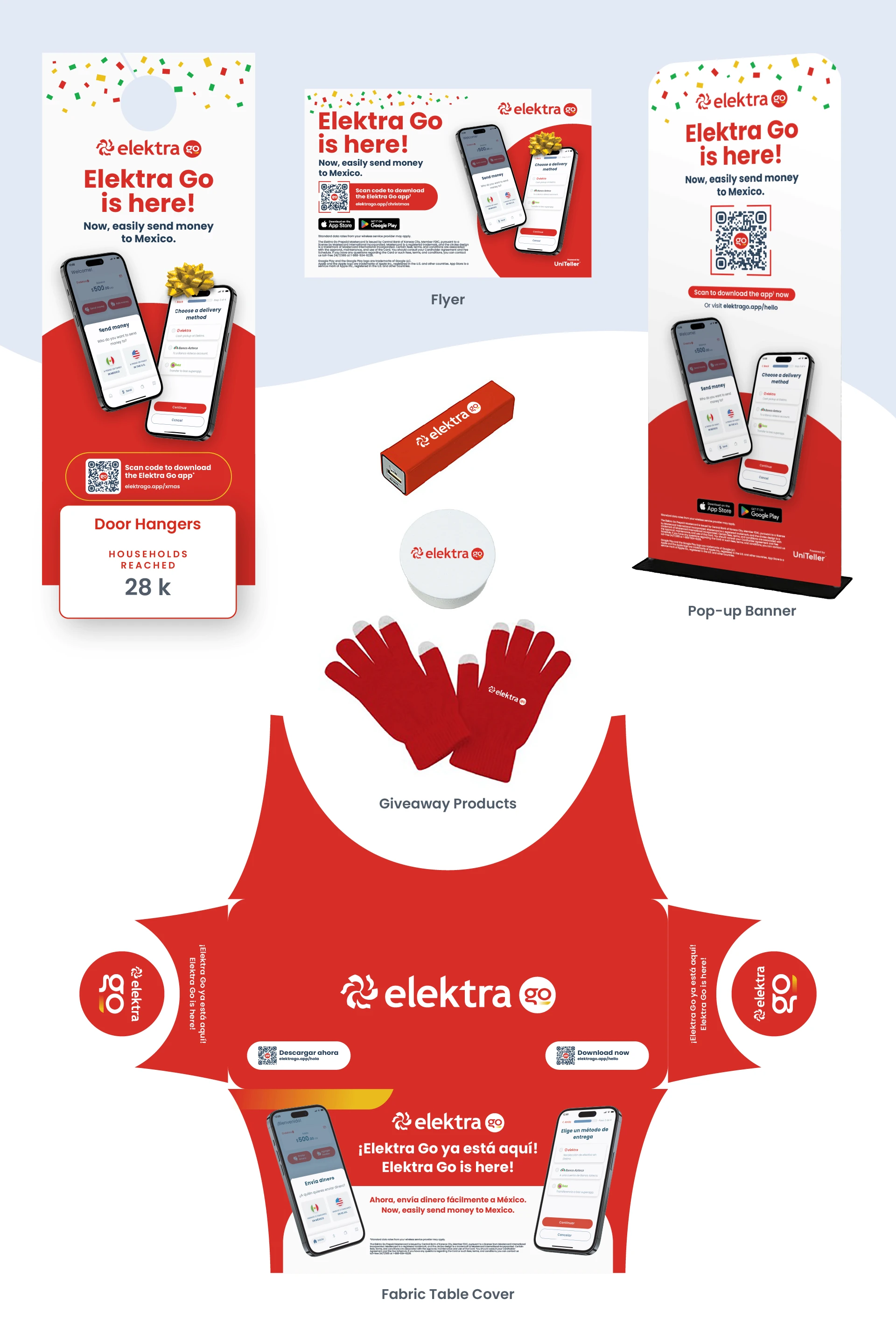 As an extension of the digital launch campaign, Elektra Go wanted to establish a physical presence in Mexican communities and events throughout Texas. To achieve this, we designed door hangers for a door-to-door campaign that reached 28,000 households. Additionally, we created flyers, signage, tabletop covers, and giveaway products for use at the Elektra Go booth at large events.