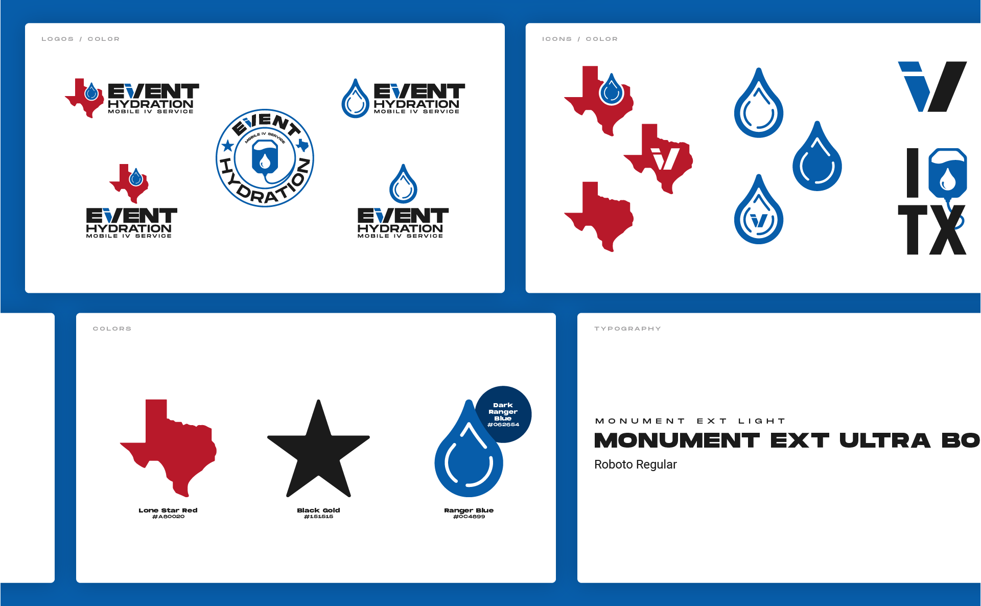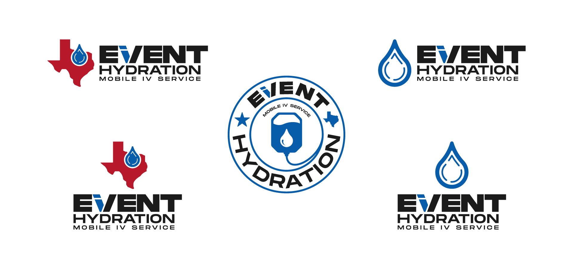 While the name "EIVENT" was unique, its spelling presented a challenge. To ensure the logo communicated the correct pronunciation ("EVENT"), we creatively combined the I and V into a single design element. This aligned with Chris’ intent and provided clarity. We also incorporated a custom saline drop and the state of Texas into the final logos, giving it a local, professional identity. Then, we created a mini style guide to round out the branding, and create consistency in logo, icon, color and typography use across all digital and print applications.